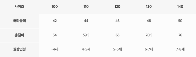 尺寸表由上而下為:尺寸、腰圍、總長、建議年齡