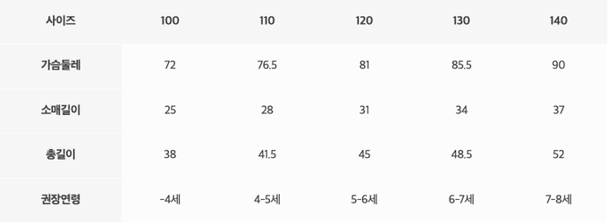 尺寸表由上而下為:尺寸、胸圍、袖長、總長、建議年齡