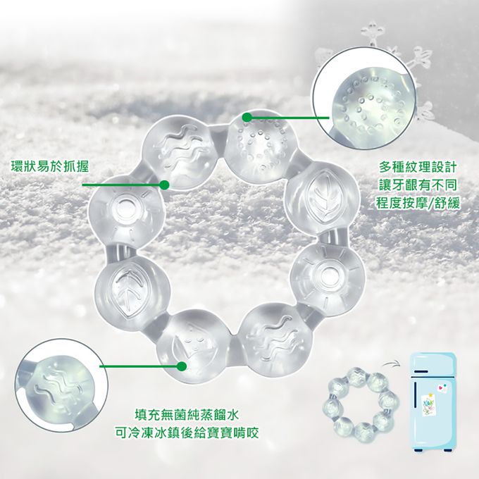 🌺 可冷凍冰鎮型固齒器:EVA 適合低溫,裡面填充無菌純蒸餾水,可冷凍冰鎮後給寶寶啃咬,清涼舒緩寶寶出牙脹痛不舒服感