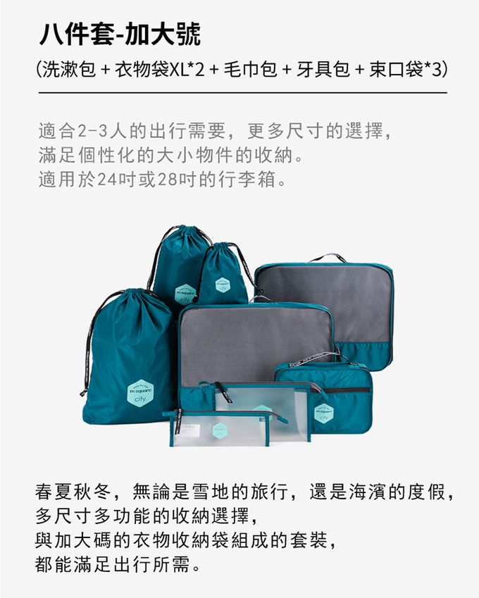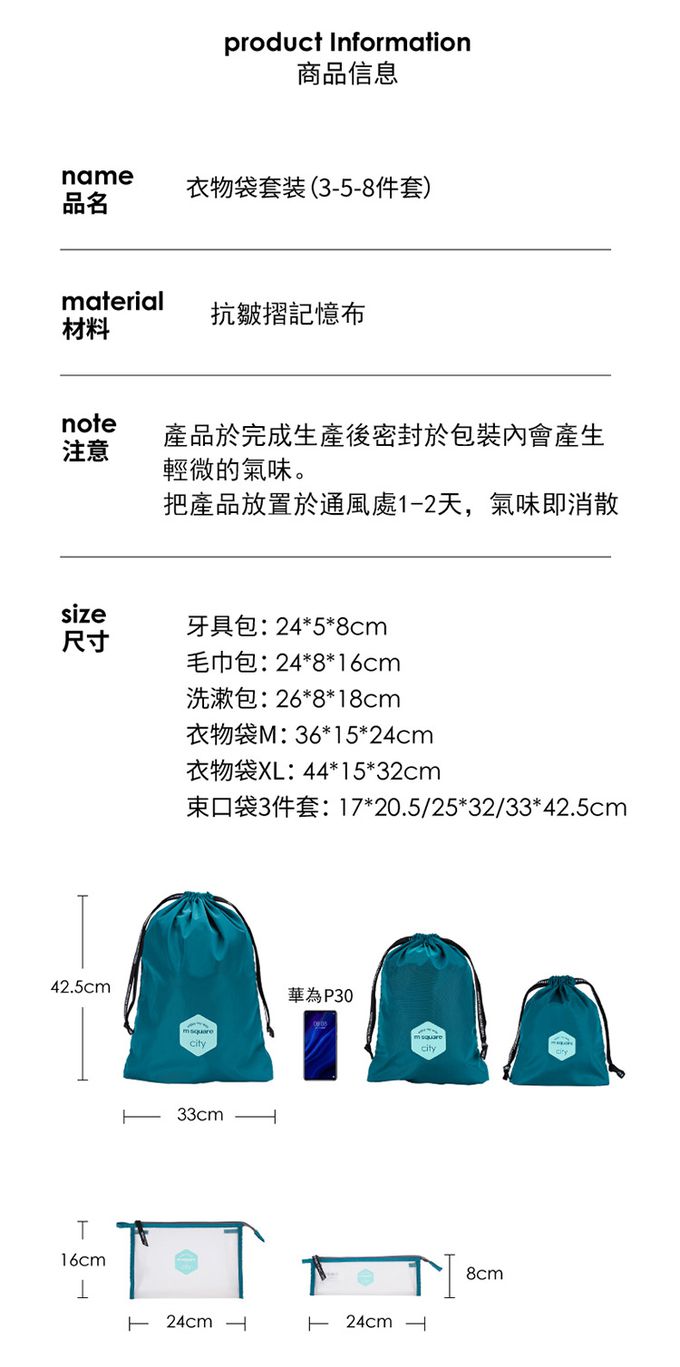 城市系列五件套-XL加大號-薄荷綠 (牙具包-24*5*8cm/毛巾包-24*8*16cm洗漱包-26*8*18cm/衣物M二入-36*1)