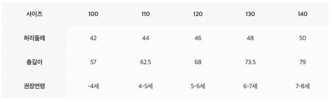 尺寸表由上而下為:尺寸、腰圍、總長、建議年齡