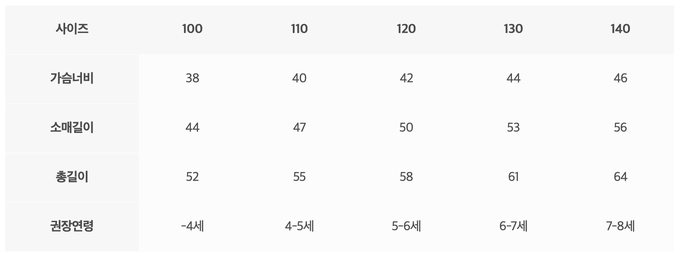 尺寸表由上而下為:尺寸、胸圍、袖長、總長、建議年齡