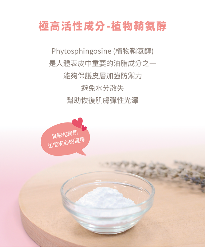成分:植物鞘氨醇、天然酪梨油、沒藥醇、甘草次酸、天然酪梨油、琉璃苣油。