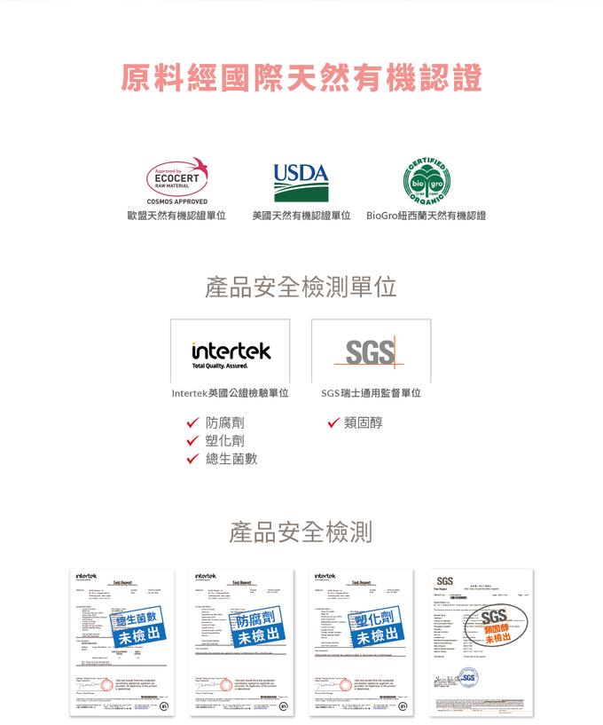 產品相關安全檢驗報告:通過美國FDA人體臨床實證、美國國家濕疹協會推薦、SGS、intertek