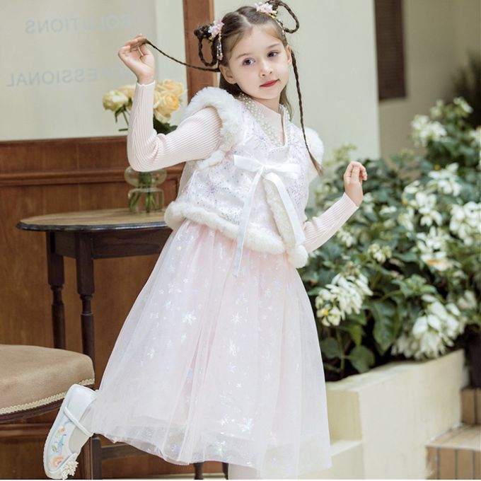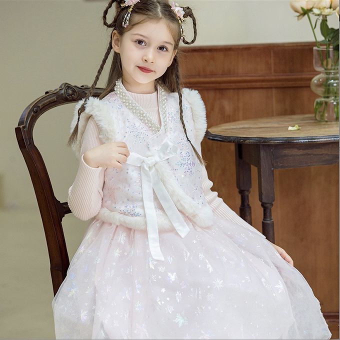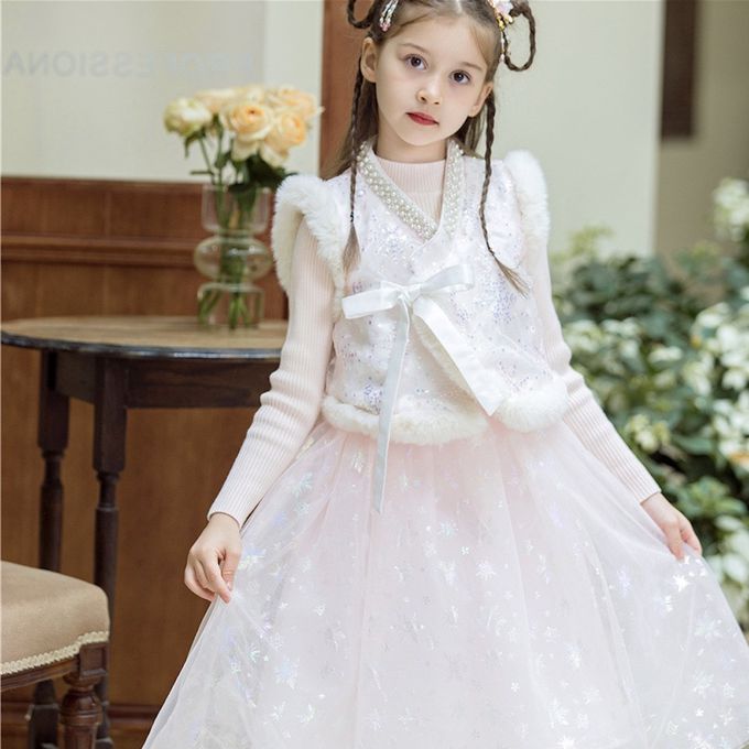 冬季冰雪刺繡亮片棉襖背心公主洋裝-背心+洋裝+珍珠髮箍