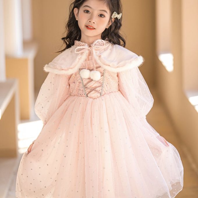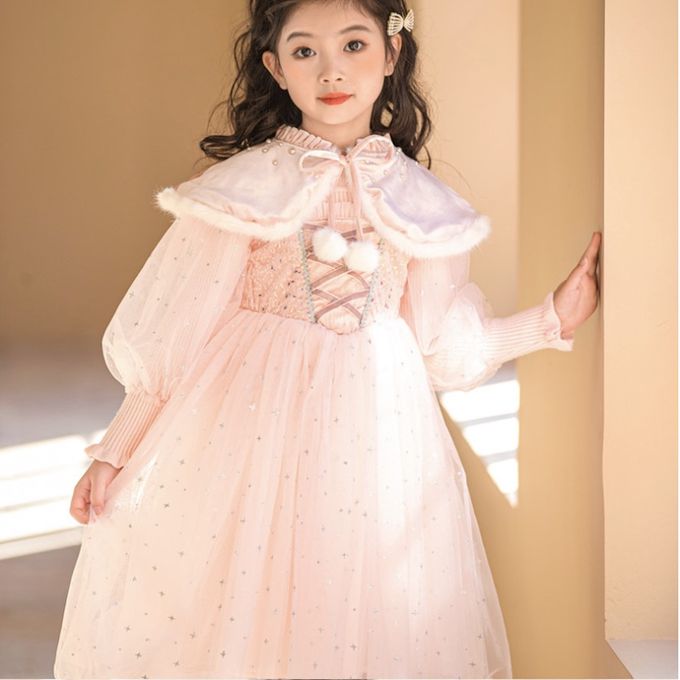 冬季毛絨領披肩公主長袖洋裝-洋裝+毛絨小領子+珍珠髮箍-粉紅色