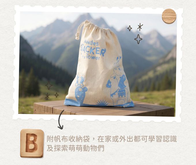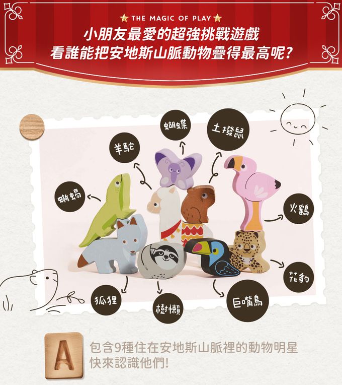 。這組安地斯動物疊疊樂,包含了羊駝、巨嘴鳥、土撥鼠、蝴蝶、火鶴、樹懶、狐狸、蜥蜴與花豹