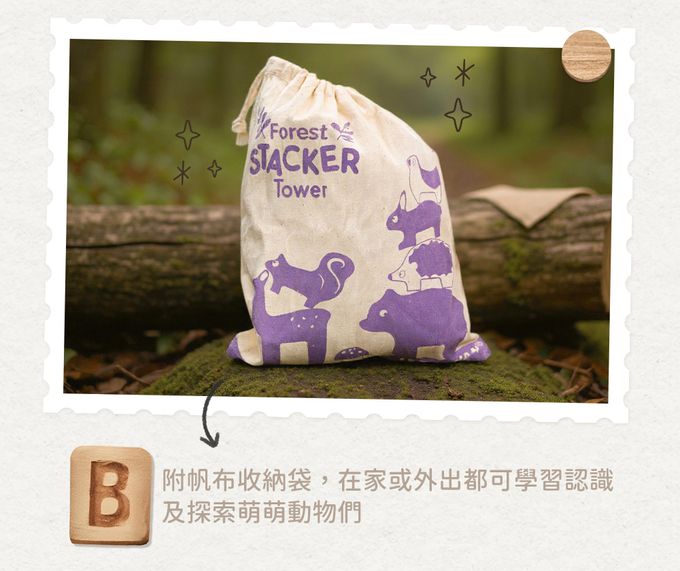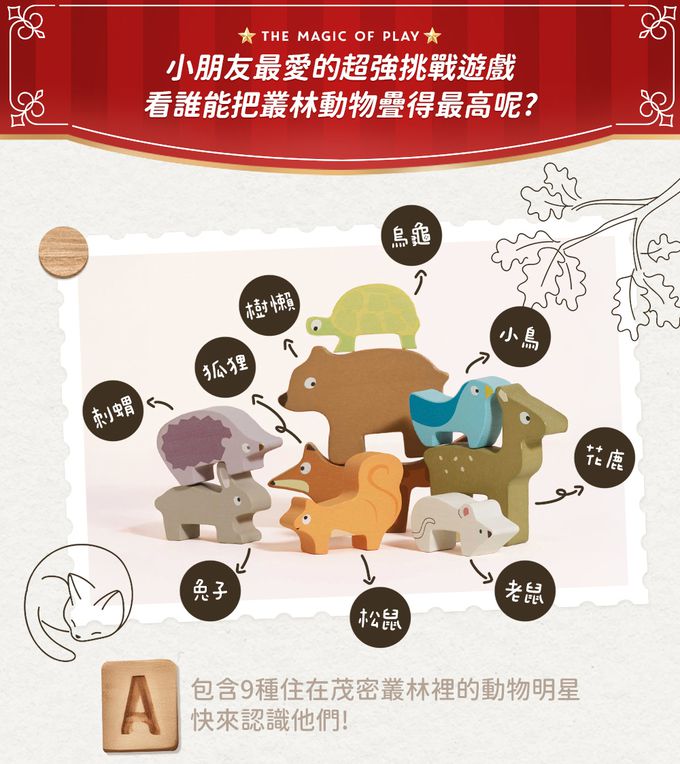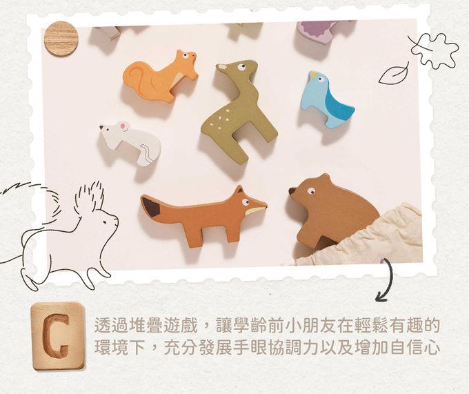 。這組森林動物動物疊疊樂,包含了小鳥、老鼠、烏龜、樹懶、狐狸、兔子、刺蝟、松鼠與花鹿