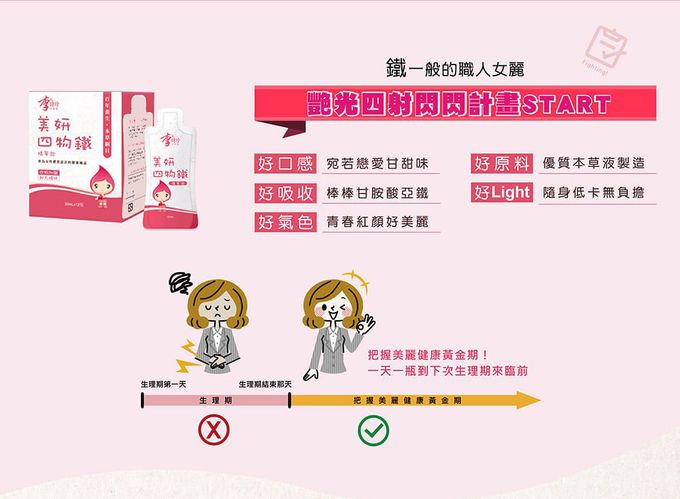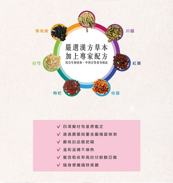 成份:純水、加味四物萃取液(純水、當歸、川芎、桂圓、芍藥、熟地,紅棗、构杞)、砂糖、甘胺酸