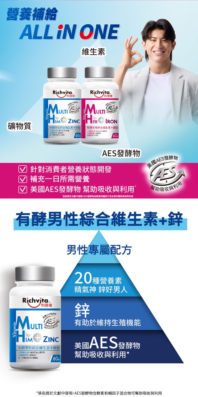 維生素C、維生素E[乙酸dl-α-生育醇酯(維生素E)、麥芽糊精、辛烯基丁二酸鈉澱粉、二氧化矽]、碳酸鈣、丁烯二酸亞鐵、聚乙烯吡咯烷酮、葡萄糖酸錳、保健食品專用膜衣(羥丙基甲基纖維素、羥丙基纖維素、聚乙二醇)、菸鹼醯胺、硬脂酸鎂、二氧化矽、氧化鎂、氧化鋅、維生素A[麥芽糊精、阿拉伯膠、玉米澱粉、維生素A醋酸酯、維生素E(抗氧化劑)]、本多酸鈣、二氧化鈦、維生素D3[辛烯基丁二酸鈉澱粉、蔗糖、L-抗壞血酸鈉(抗氧化劑)、中鏈三酸甘油酯、二氧化矽、生育醇(維生素E)(抗氧化劑)、維生素D3]、焦磷酸鐵(玉米澱粉、焦磷酸鐵、向日葵卵磷脂)、硫酸銅、維生素B6、維生素B1、維生素B2、維生素K1(阿拉伯膠、維生素K1、蔗糖)、食用黃色五號鋁麗基、食用紅色四十號鋁麗基、葉酸、生物素、維生素B12