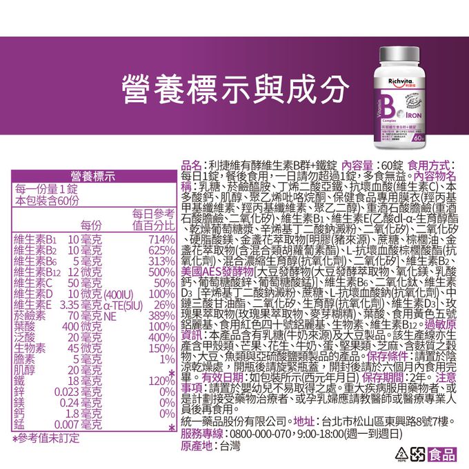 菸鹼醯胺、丁烯二酸亞鐵、抗壞血酸(維生素C)、本多酸鈣、肌醇、聚乙烯☆咯烷酮、保健食品專用膜衣(羥丙基甲基纖維素、羥丙基纖維素、聚乙二醇)、重酒石酸膽鹼(重酒石酸膽鹼、二氧化矽)、維生素B1、維生素E〔乙酸dl-α-生育醇酯、麥芽糊精、辛烯基丁二酸鈉澱粉、二氧化矽〕、二氧化矽、硬脂酸鎂、維生素B2、維生素B6、二氧化鈦、維生素D3〔辛烯基丁二酸鈉澱粉、蔗糖、L-抗壞血酸鈉(抗氧化劑)、中鏈三酸甘油酯、二氧化矽、生育醇(抗氧化劑)、維生素D3〕、葉酸、食用黃色五號鋁麗基、食用紅色四十號鋁麗基、生物素、維生素B12