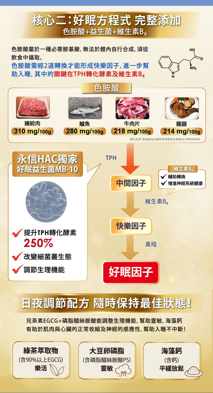 添加舒眠原料「L-色胺酸」;搭配益生菌與維生素B6幫助好眠營養生成!