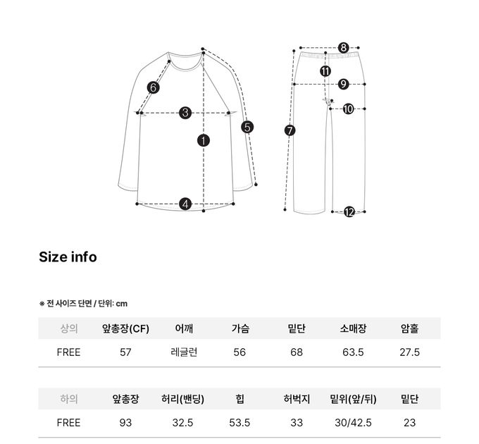下著尺寸表由左而右為:總長、腰寬、臀寬、大腿寬、襠長(前/後)、下擺長(單位為公分)
