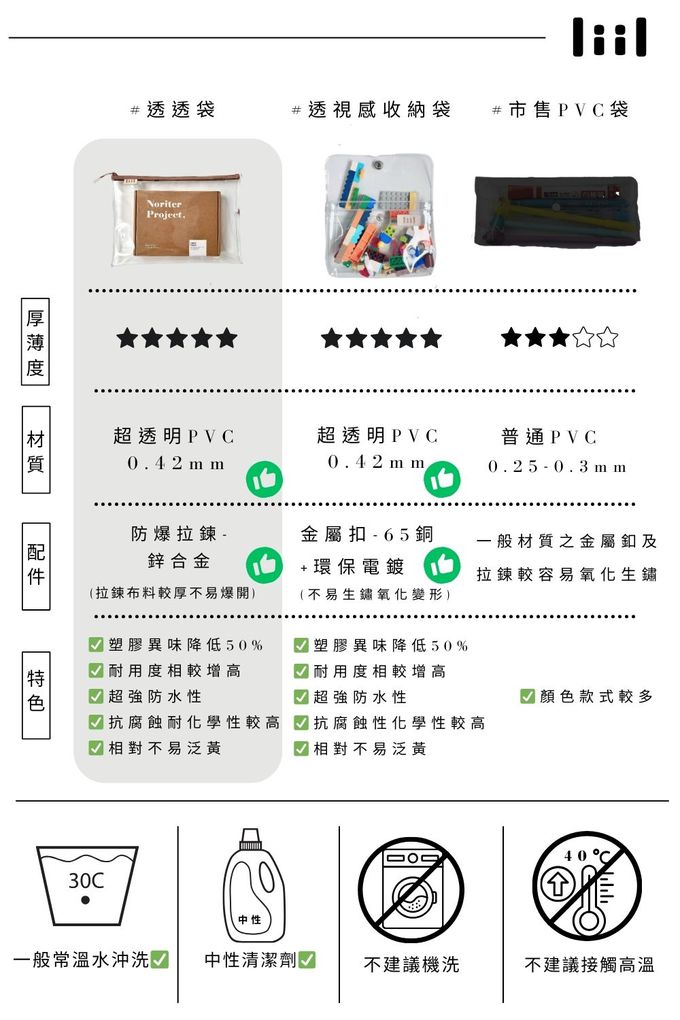 透明的收納袋讓物品一目了然,防潑水好清洗