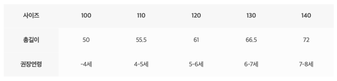 尺寸表由上而下為:尺寸、總長、建議年齡