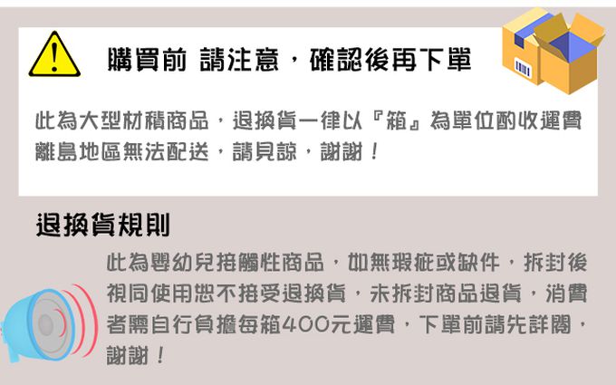 如需退換貨,請於收到商品7天(含例假日內提出),如為瑕疵退換貨所產生的運費,將由媽咪愛負責處理,若非瑕疵退貨,您可至『查詢訂單』>『已出貨』中查詢該筆訂單,並點選『我要退貨』即可進行申請。若有相關退貨問題,請至媽咪愛