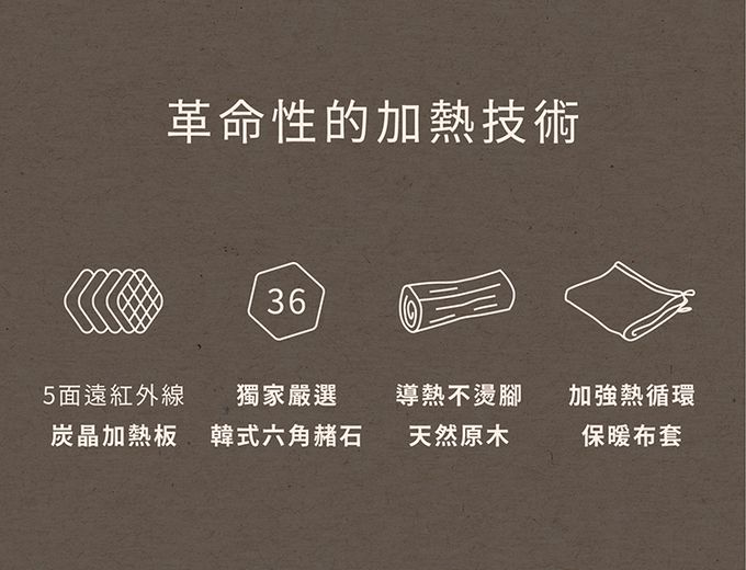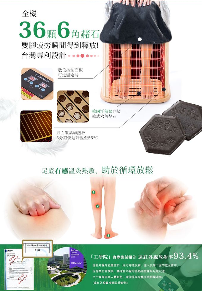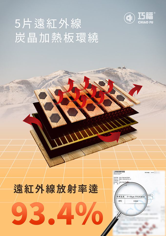 • 遠紅外線碳晶加熱板,遠紅外線釋放率達93.4%
