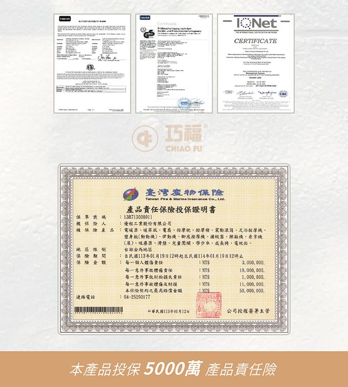 • 產品相關安全檢驗報告:5000萬產品責任險