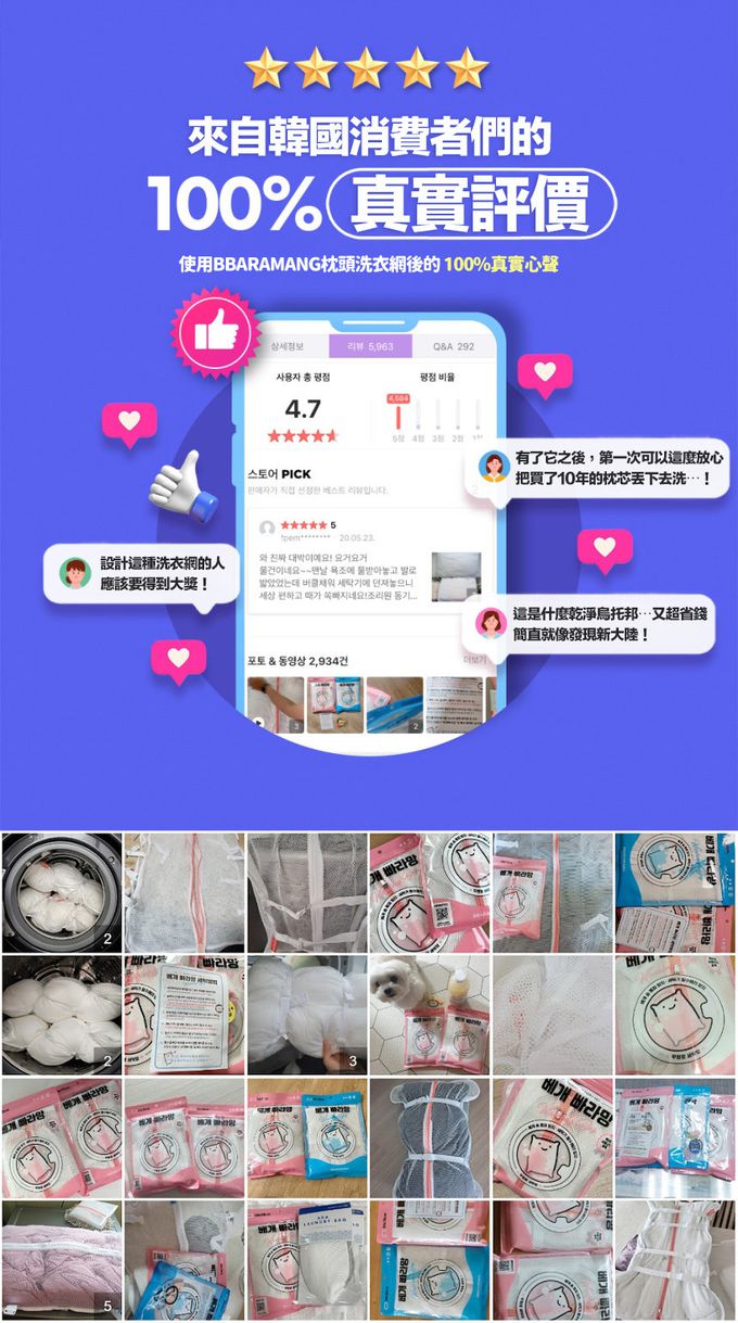 【BBARAMANG】在 Naver 是非常有人氣的商品!不僅在「枕頭洗衣網」關鍵字位列第 1,銷售量也是第 1!目前銷售累計破20萬,顧客滿意度高達97%!附上許多真實評價,讓人非常安心~
