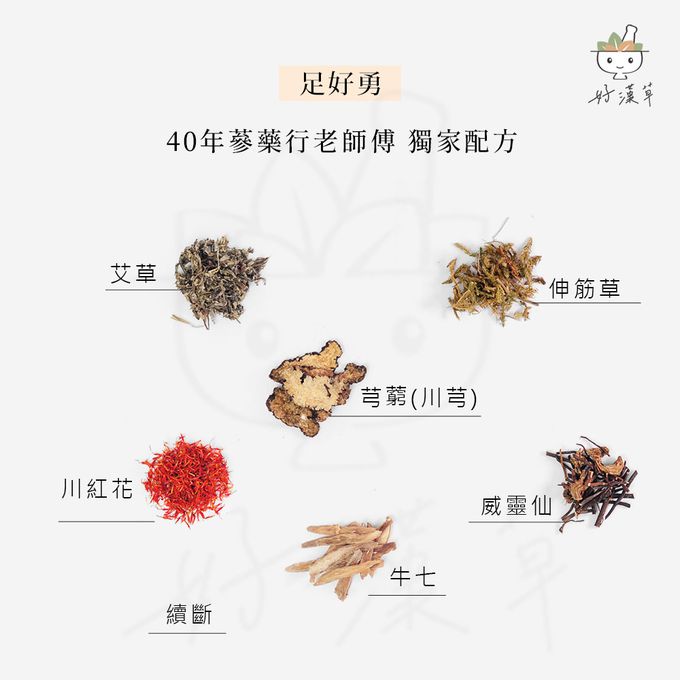 成分:成分:威靈仙、川紅花、伸筋草、牛七、川芎、續斷、艾草