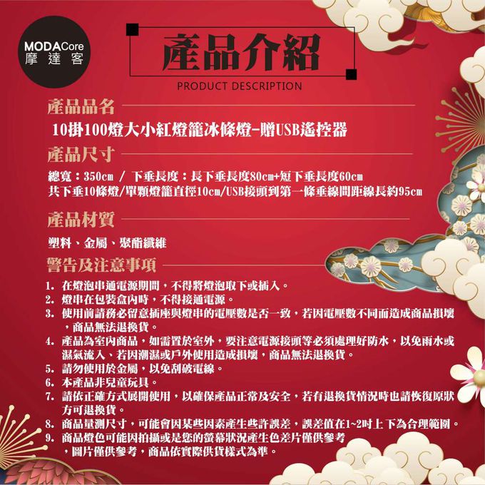 品名:◉春節元宵開運招財◉10掛100燈大小紅燈籠冰條燈-贈USB遙控器