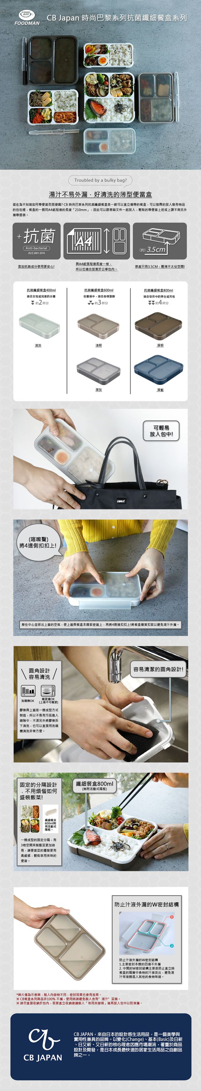 纖細餐盒四邊緊緊的固定住盒子,湯汁不易漏出,平整的四邊可以直直放入袋中攜帶。內部一體式分隔線,你可以將配料分開放置,食物不亂移動,內部圓角設計,容易食用、洗條、方便去除污垢,材質添加抗菌劑衛生更升級,輕鬆享受午餐好時光。