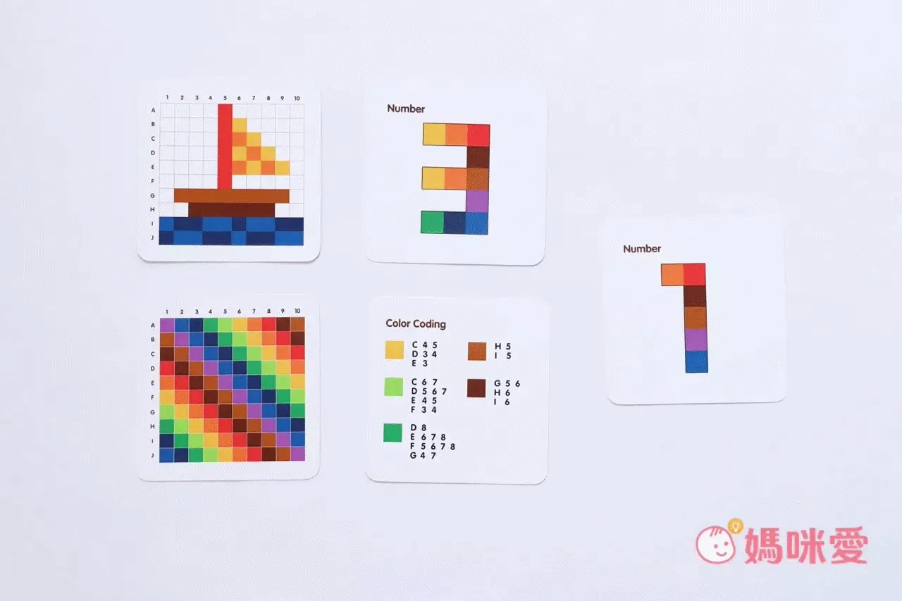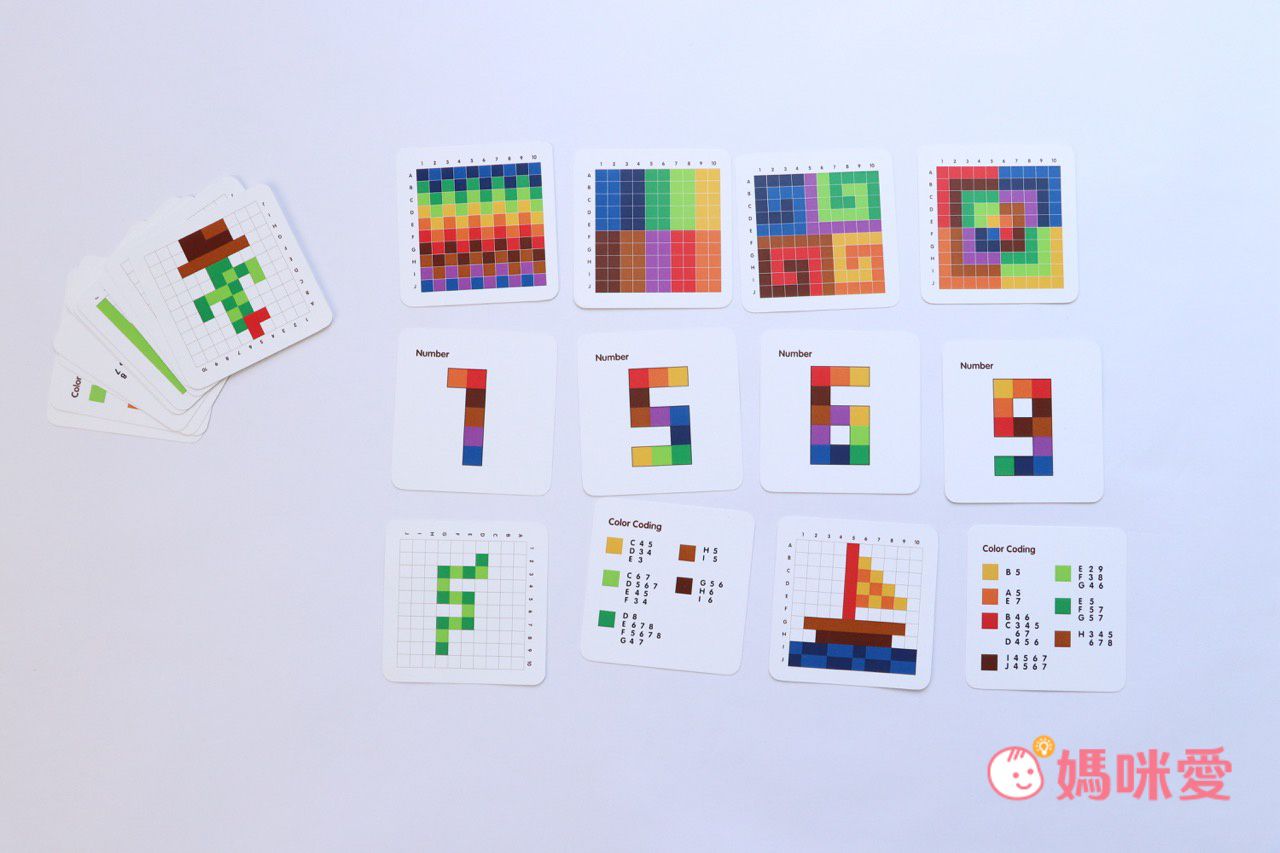 如果不知道從何玩起也沒關係!媽咪覺得有引導式小卡的設計,讓孩子更能著手去發掘好玩的遊戲:像是依照卡上拼出數字、圖案、幾何變化等⋯。