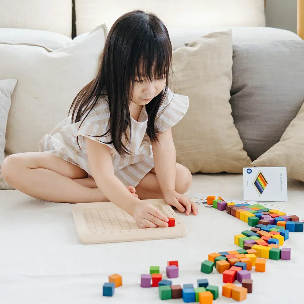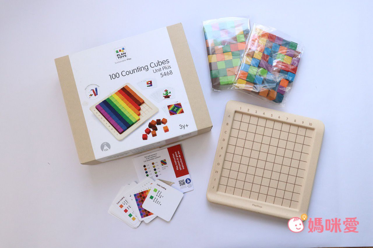 內容物有:100顆彩色方塊、木板、玩法說明手冊還有引導式小卡~