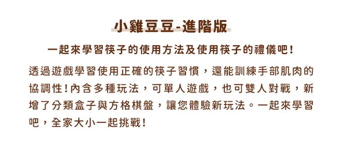 小雞豆豆進階版,8歲兒子超喜歡的,説好像便當盒,塑膠筷子很滑,小朋友不容易夾,可以用橡皮筋增加阻力,加強孩子信心度, 兒子喜歡拿他的學習筷與媽媽對戰速度。