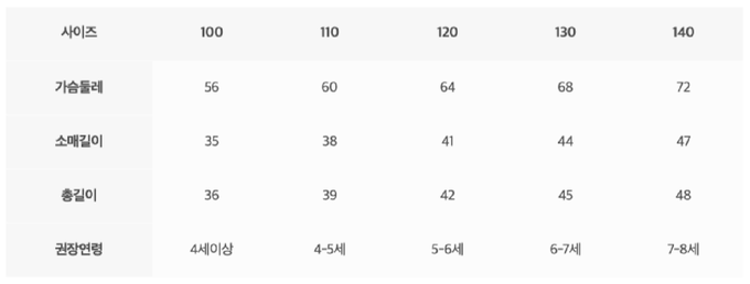 尺寸表由上而下為:尺寸、胸圍、袖長、總長、建議年齡