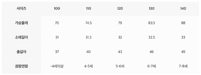 尺寸表由上而下為:尺寸、胸圍、袖長、總長、建議年齡