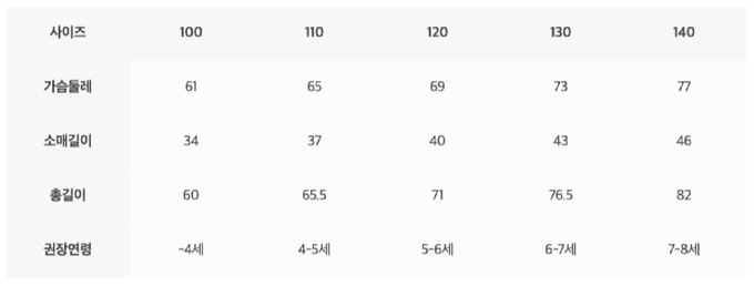 尺寸表由上而下為:尺寸、胸圍、袖長、總長、建議年齡