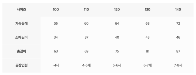 尺寸表由上而下為:尺寸、胸圍、袖長、總長、建議年齡