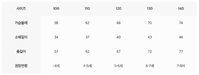 尺寸表由上而下為:尺寸、胸圍、袖長、總長、建議年齡