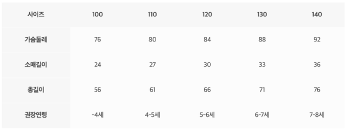 尺寸表由上而下為:尺寸、胸圍、袖長、總長、建議年齡