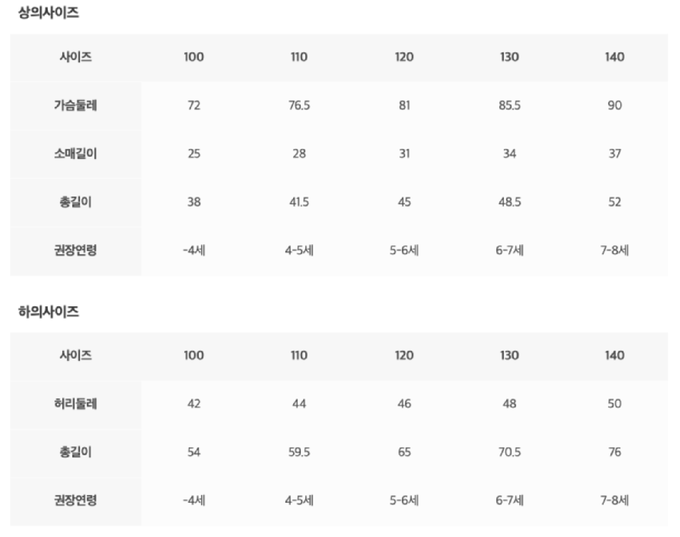 上衣尺寸表(上)由上而下為:尺寸、胸圍、袖長、總長、建議年齡