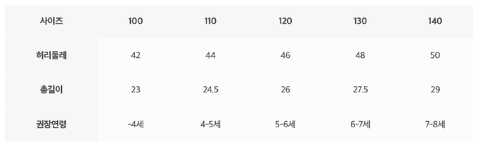 尺寸表由上而下為:尺寸、腰圍、總長、建議年齡