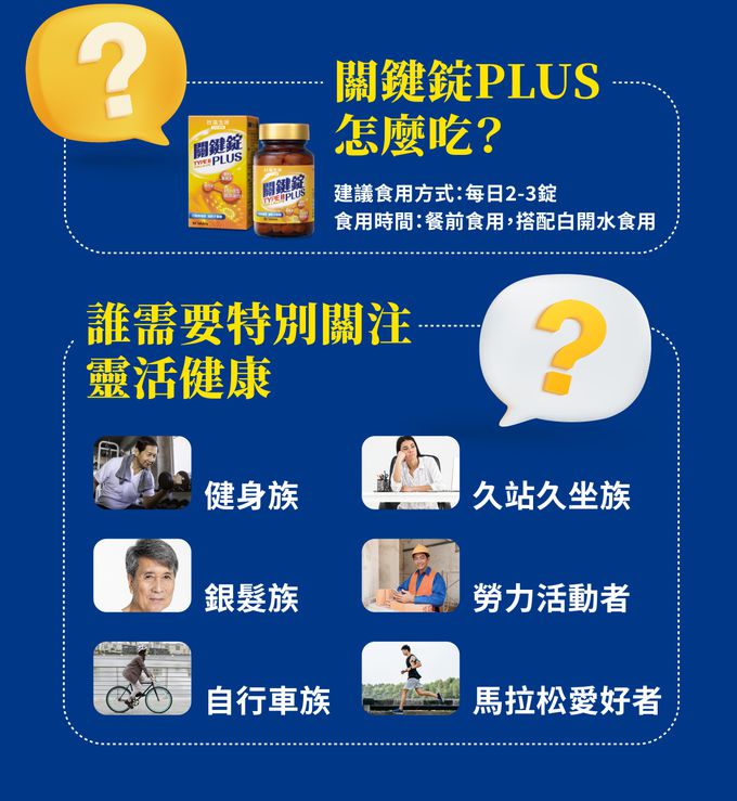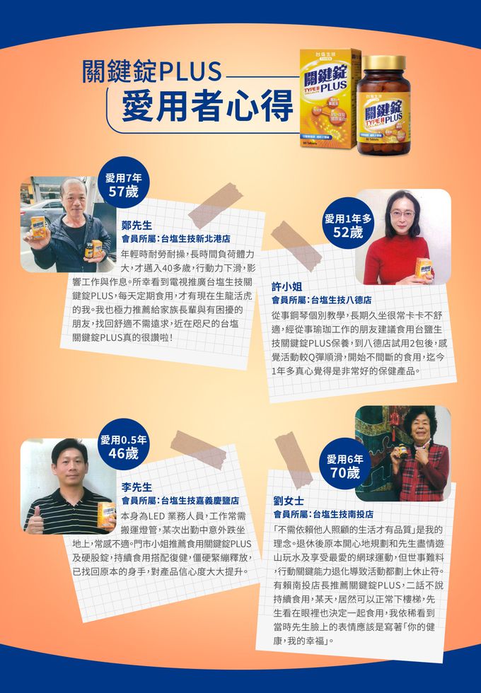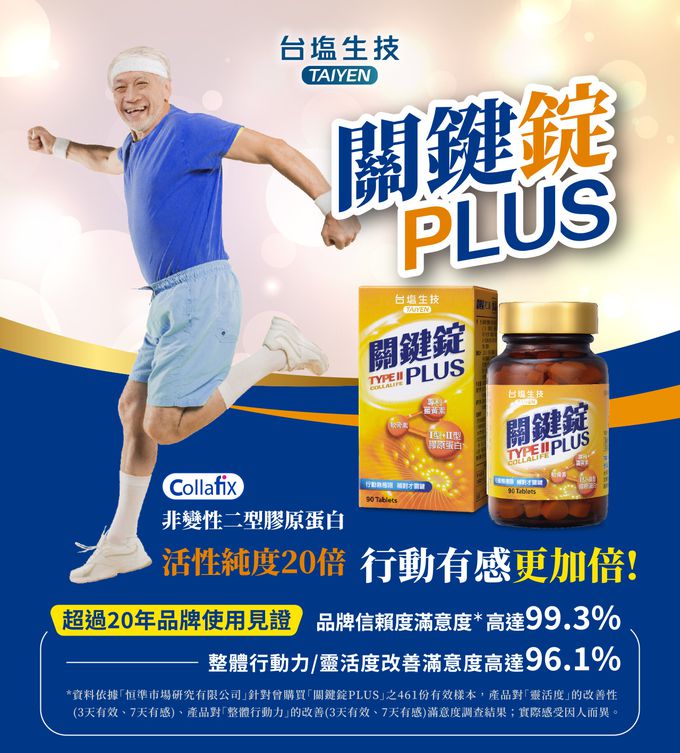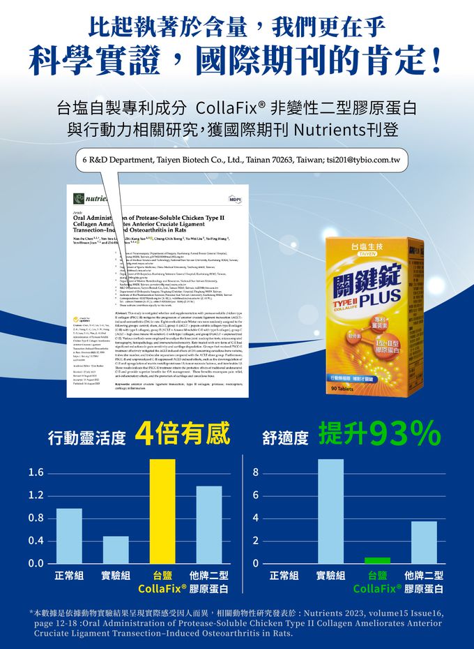 成分:葡萄糖胺鹽酸鹽、軟骨素、膠原蛋白(含I、II型膠原蛋白)、薑黃萃取物、微生素C、微結晶狀α纖維素、聚乙烯咯烷酮、乳糖、膜衣(二氧化鈦、羥丙基甲基纖維素(羥丙基甲基纖維素、水、氯化鈉)、聚乙烯醇、聚乙二醇、滑石粉、卵磷脂、食用黃色4號、玉米糖膠、食用黃色5號、食用藍色1號)、硬脂酸鎂、碳酸鎂、胡椒鹼