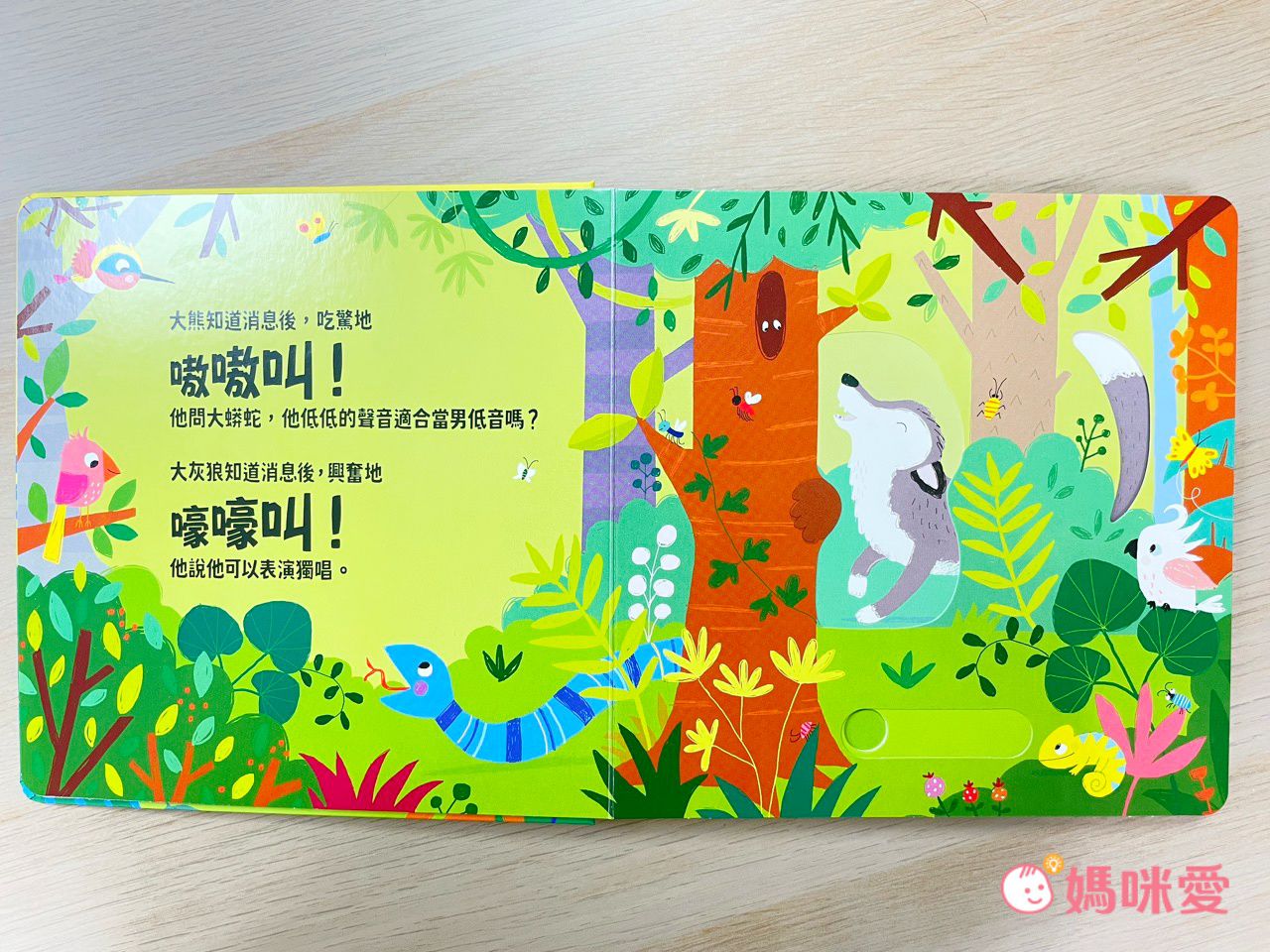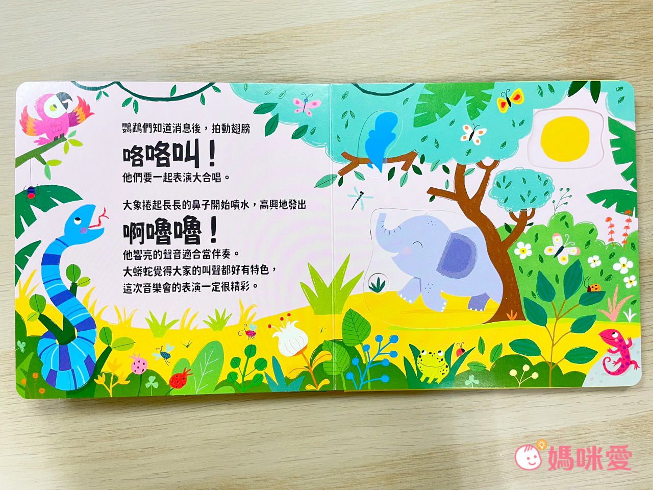 聲音清晰悠揚,讓人彷彿置身在熱帶雨林裡,聽著由動物們的叫聲譜成的美妙樂曲。此外,本書的音量適中,既不會大到損害孩子的耳朵,也不會小聲到聽不清楚,恰到好處的音量,打造完美的聲音品質!