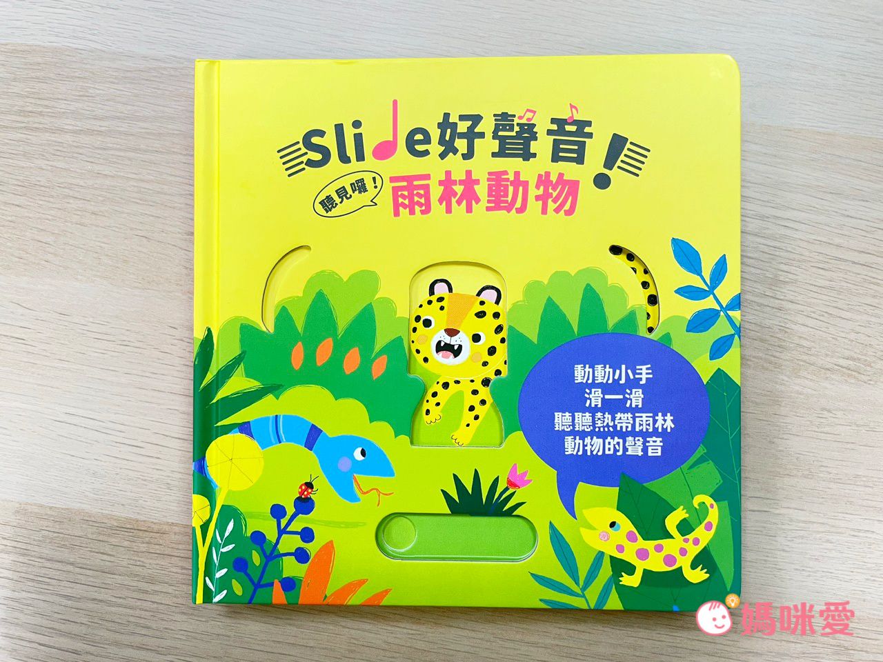 在【Slide 好聲音!聽見囉!】系列中,每一個跨頁都有滑動的音效機關,當孩子滑動機關的時候,就可以立即聽到兩種不同的雨林動物的聲音,有老虎、花豹、犀牛和大象等,透過高音質的呈現,讓孩子迅速地感知聲音的變化,並認識各種動物叫聲的特徵。
