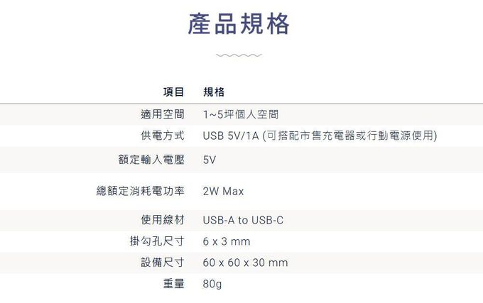 供電資訊:USB 5V/1A (可搭配市售充電器或行動電源使用) 額定功耗:2W