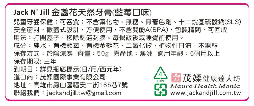 JACK'N JILlL膏有淡淡香味,但卻是天然無糖的唷!使用金盞花萃取的成分,而且不含氟化物、無糖、無著色劑等,作為兒童牙膏最安心了,可吞食,就算小朋友誤食也不擔心。