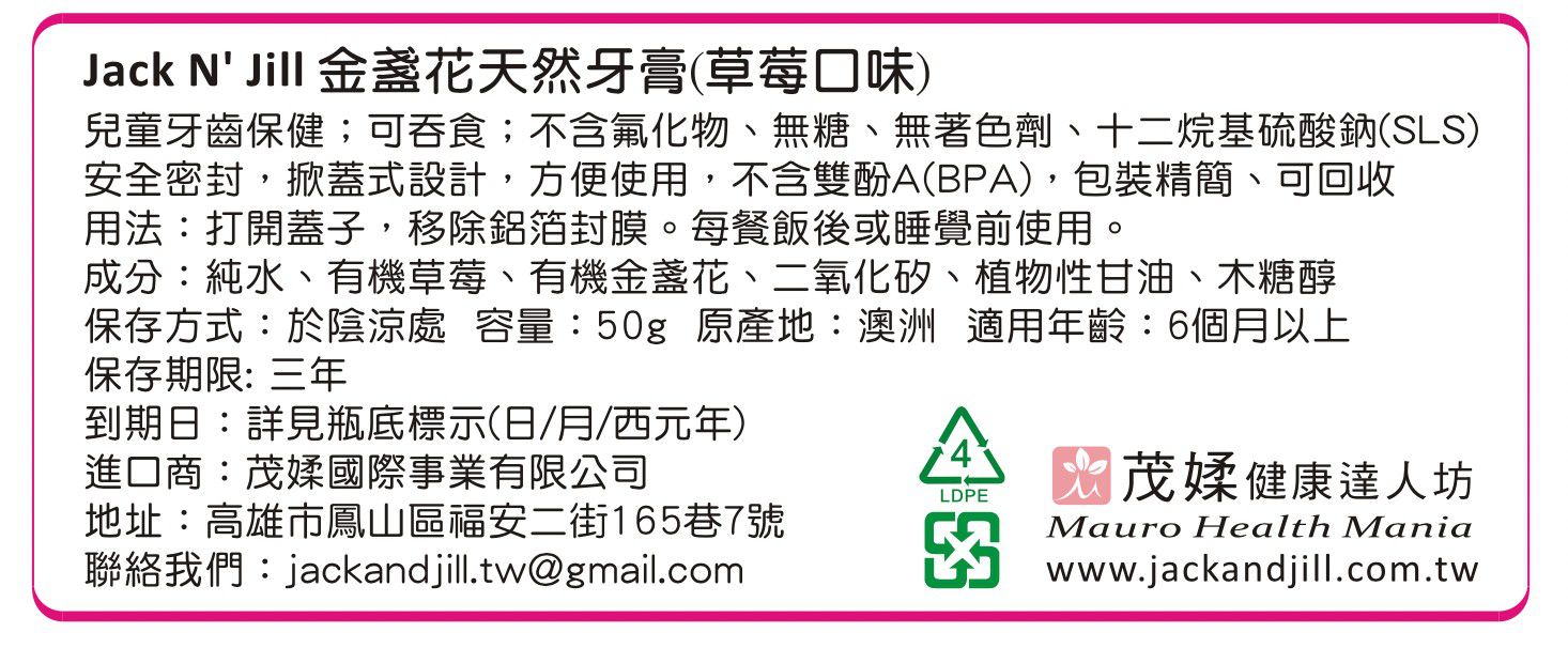 JACK'N JILlL膏有淡淡香味,但卻是天然無糖的唷!使用金盞花萃取的成分,而且不含氟化物、無糖、無著色劑等,作為兒童牙膏最安心了,可吞食,就算小朋友誤食也不擔心。