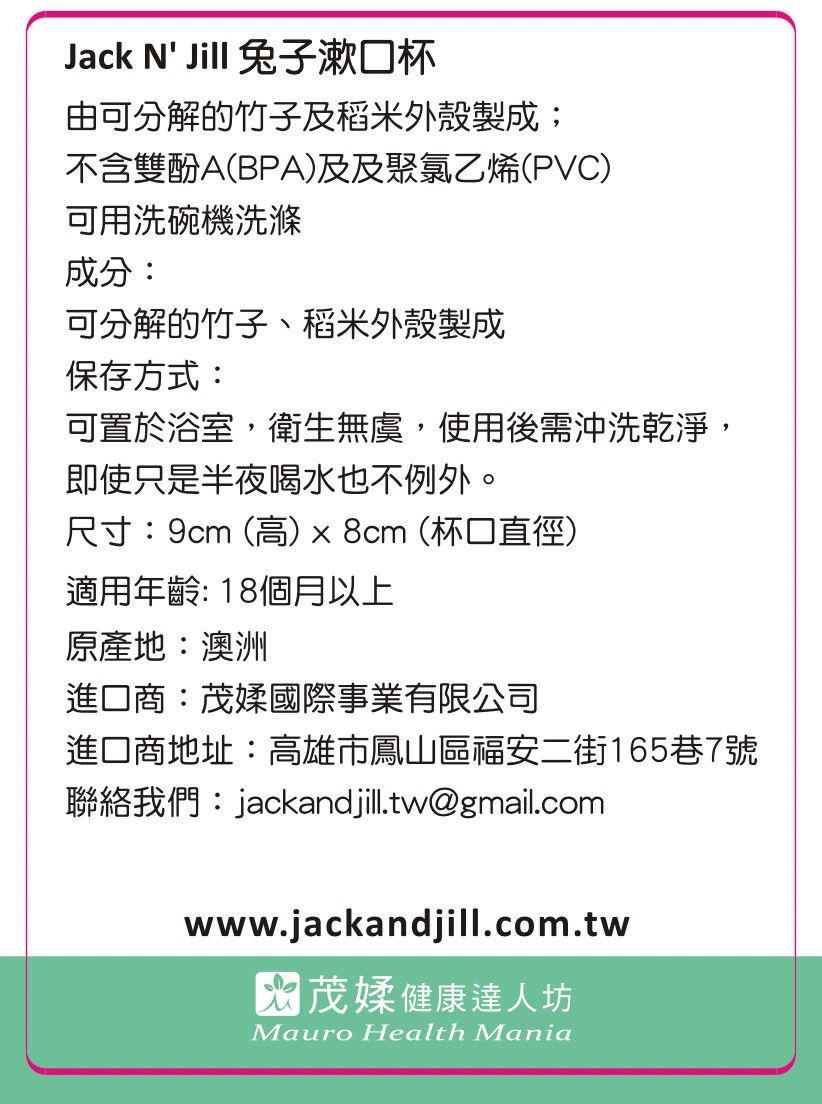 Jack'n Jill漱口杯使用環境可分解材質製成,不含雙酚 A 、聚氯乙烯等有害物質,使用很放心,清潔時也可以直接放洗碗機洗滌喔!
