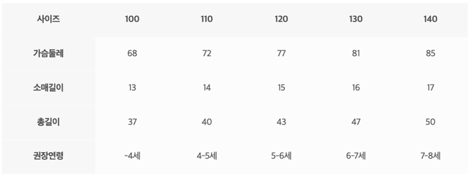 尺寸表由上而下為:尺寸、胸圍、袖長、總長、建議年齡