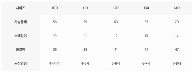 尺寸表由上而下為:尺寸、胸圍、袖長、總長、建議年齡
