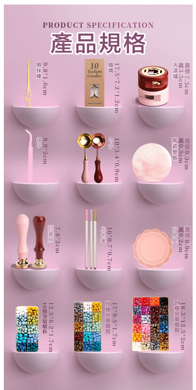注意事項:1. 商品使用需要用蠟燭融化蠟粒,使用時請注意周遭環境及自身安全,避免發生火災以及燙傷。 2. 本商品請勿放在容易被幼兒拿取到的位置。 3. 本產品請勿讓兒童單獨使用,監護人須在旁監護使用。