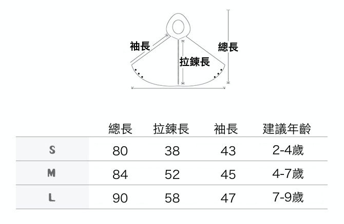 斗篷雨衣一體成型的剪裁對學齡孩童來說非常方便,揹書包也不卡卡,穿脫也很便利!