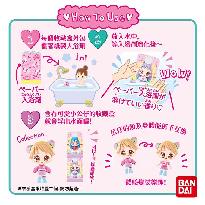 每個衣櫥盒包覆著紙製入浴劑,內含一個時髦小女孩公仔(尺寸約5cm)共有4款,採隨機出貨,只要將衣櫥盒放入水中,等入浴劑(紙製)溶化後,衣櫥盒(含時髦小女孩公仔)就會浮出水面喔!好驚奇!會出現哪一個呢?公仔的頭及身體能拆下互換,可體驗變裝樂趣喔!一起來收集吧! 收集越多,變裝樣式越多喔! 衣櫥盒可上下二個堆疊擺放! 打開衣櫥盒,小公仔還可單獨拆下喔!另附貼紙1張,可幫衣櫥做裝飾喔! 香味:小蒼蘭香氣