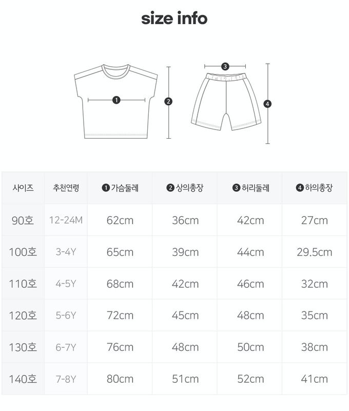 尺寸表由左而右為:尺寸、建議年齡(虛歲)、胸圍、衣長、腰圍、褲長